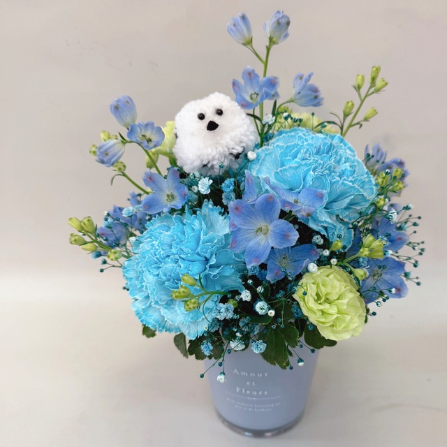 生花フラワーアレンジメントシマエナガブルー系ふわふわデザインそのまま飾れるお祝い誕生日記念日