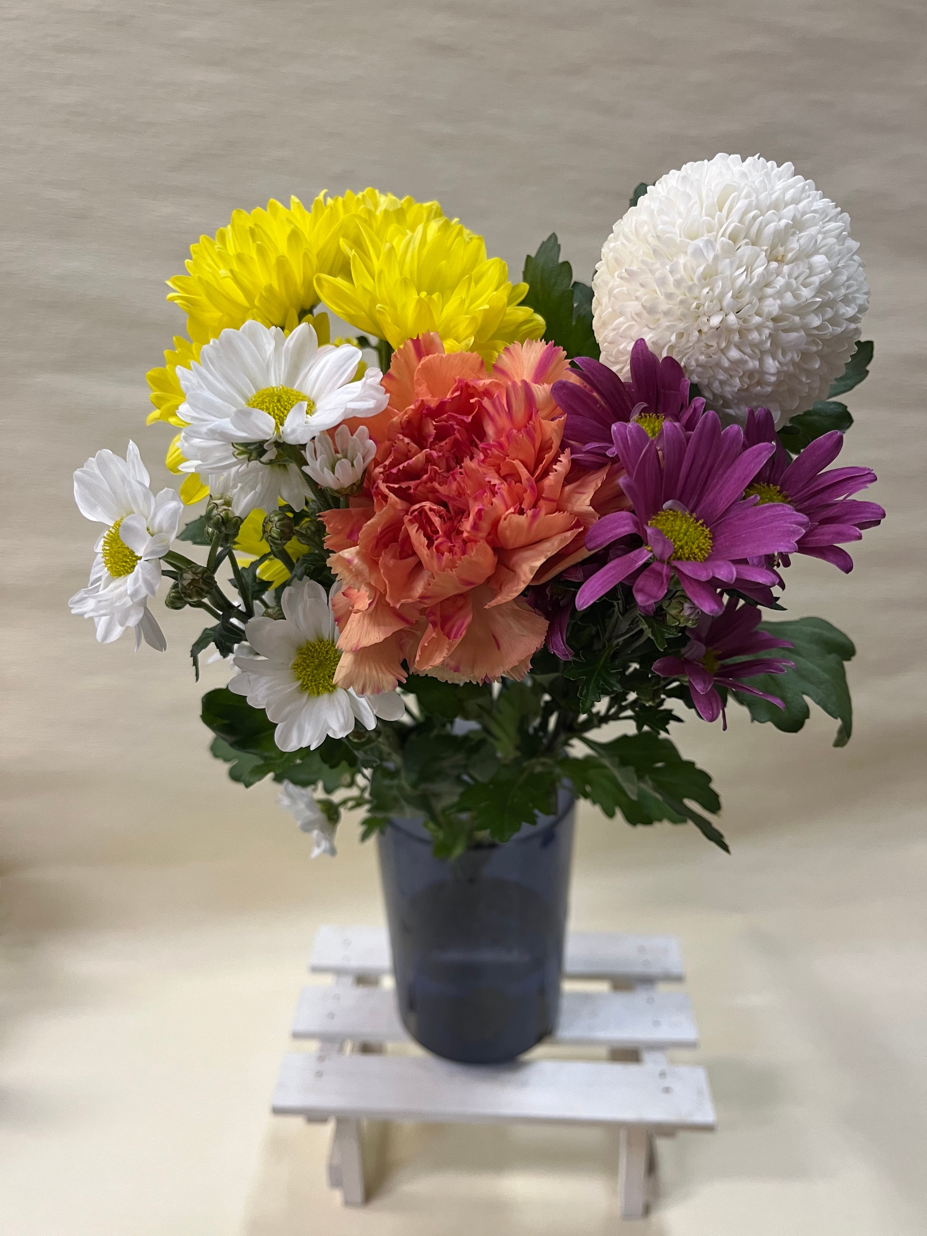お花はお任せでお届けし、季節ごとの厳選された菊を中心に取り合わせます。簡単にお飾りいただけます。