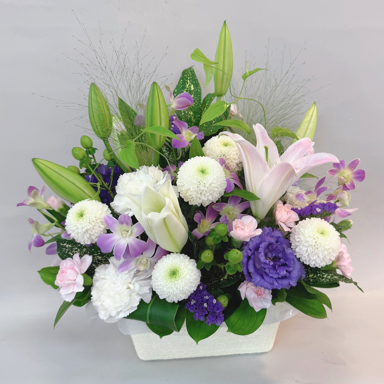# 生花お供え花お盆彼岸法要色花いれて優しい感じフラワーアレンジメント