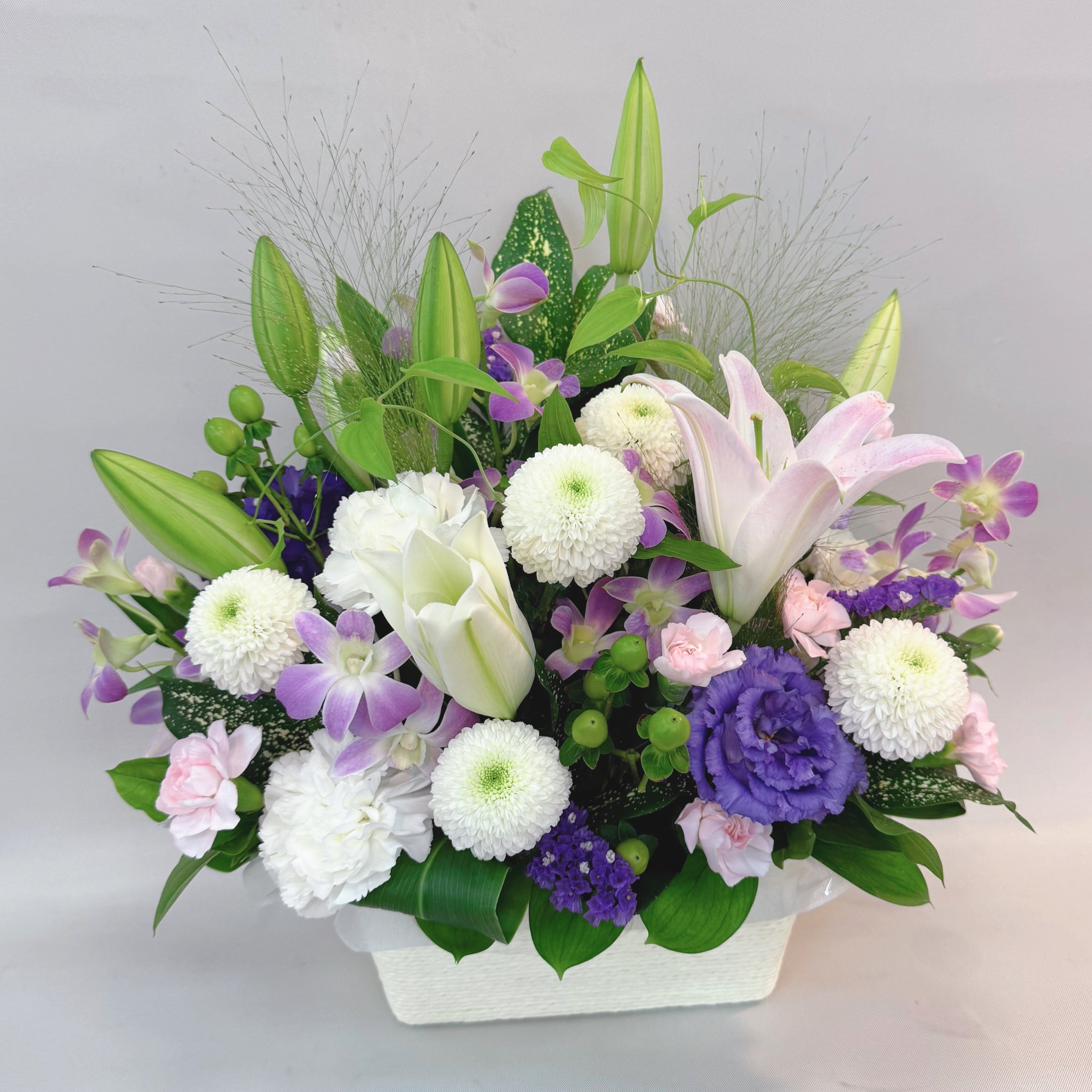 厳選した新鮮な花材を使用し、品質には細心の注意を払っています。この特別なフラワーアレンジメントが、故人への思いを豊かに表現することができるよう、信頼できる素材にこだわっています。