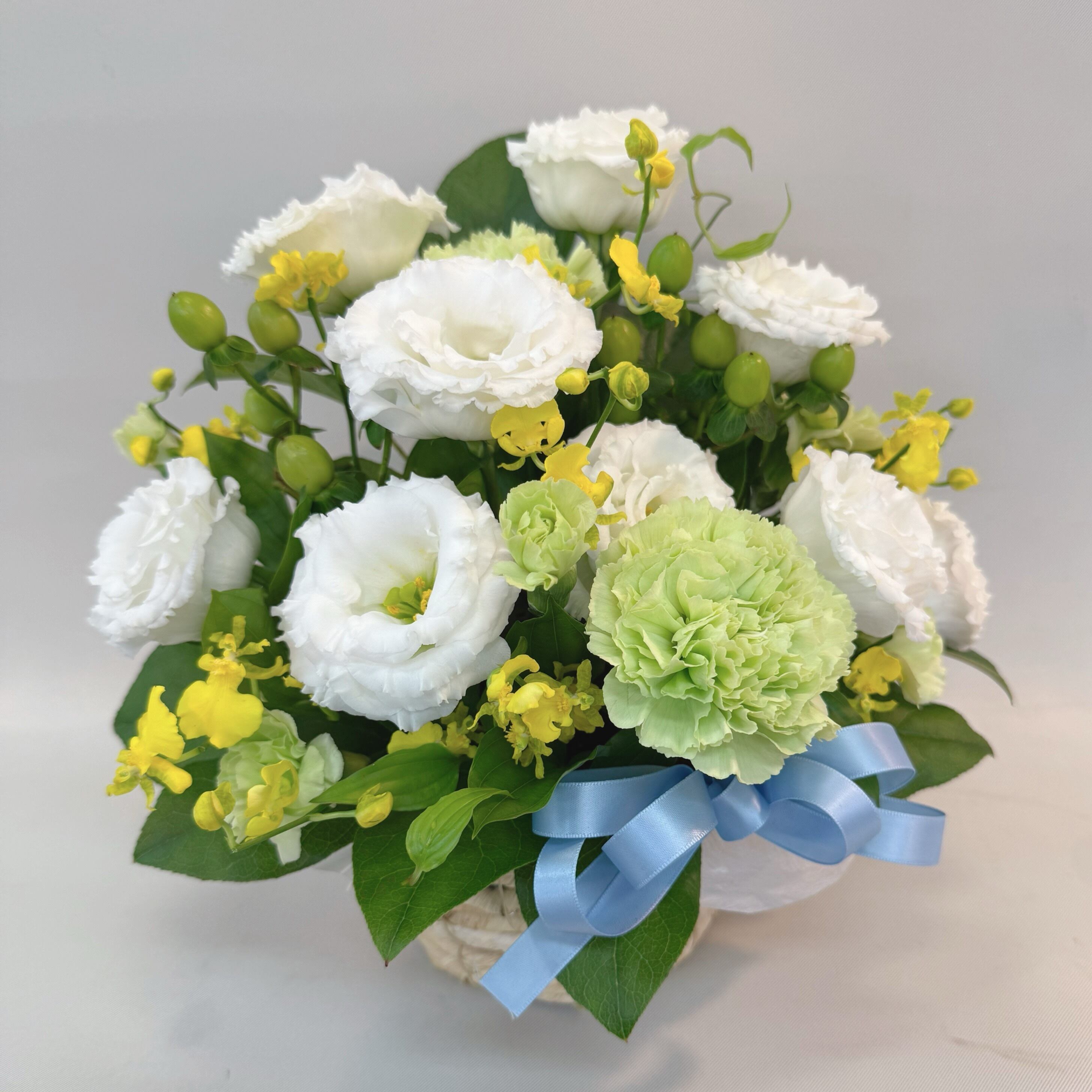 厳選された新鮮な花材を使用し、品質には細心の注意を払っています。このアレンジメントが、贈る方々の思いを大切に表現できるよう、信頼できる素材にこだわっています。